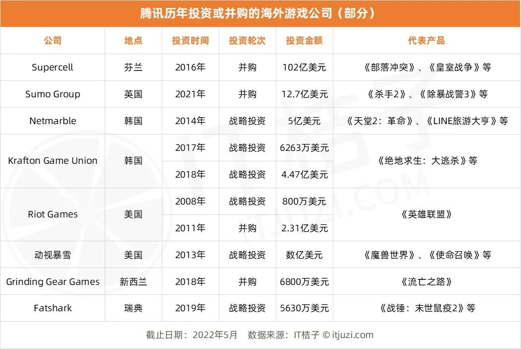 除此外,腾讯在海外投资或并购的代表游戏公司还有《杀手 2》、《除暴战警 3》的开发商 Sumo Group;《天堂 2:革命》、《LINE 旅游大亨》的开发商 Netmarble;《流亡之路》的开发商 Grinding Gear Games 以及《战锤:末世鼠疫 2》的开发商 Fatshark。