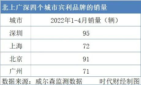 北上广深四个城市宾利品牌销量 图源/时代财经制