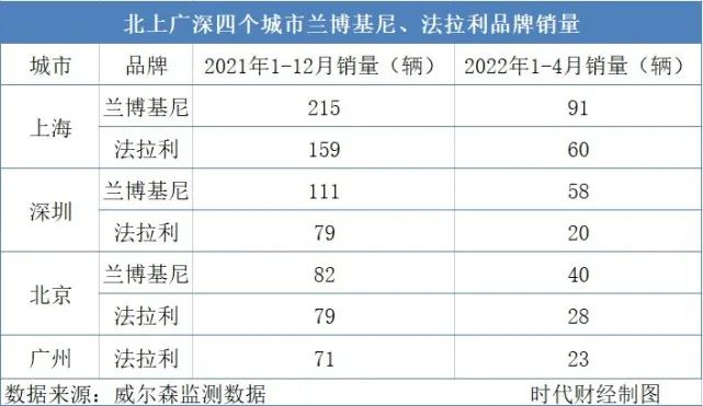 北上广深四个城市兰博基尼、法拉利品牌销量 图源/时代财经制