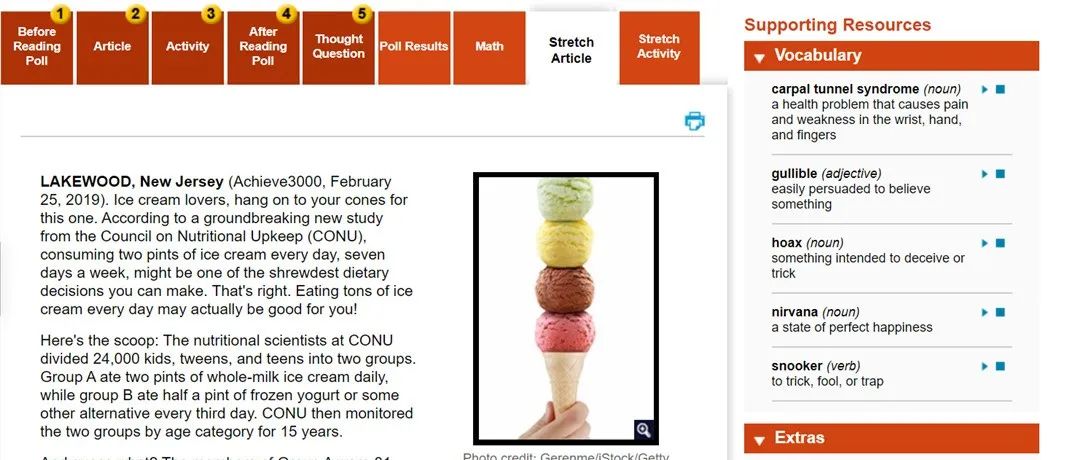 比较一下,Stretch Article用词会更难一点,注意右侧的词汇表变了哦,相应的,阅读理解题也会难些。
