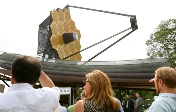 资料图:2007年5月10日,人们在美国华盛顿国家广场参观詹姆斯·韦布望远镜的仿真模型。新华社记者 吕明响 摄
