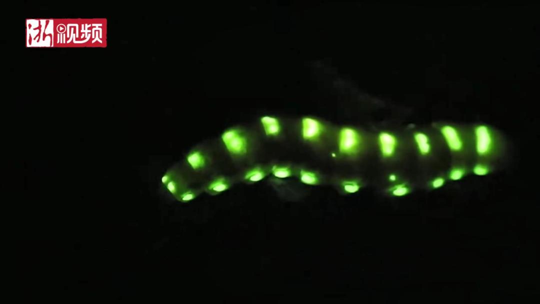 ●6月8日,浙江磐安大盘山自然保护区发现一种罕见萤火虫——雌光萤。雌光萤对生存环境要求极高,这只雌光萤身长7厘米,全身共10节,有30多处发光点,像一条绿色灯带。(来源:浙江日报)