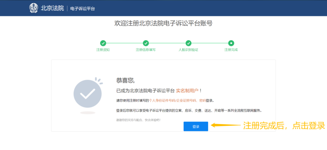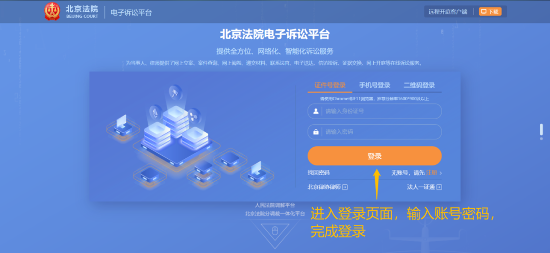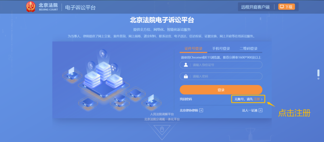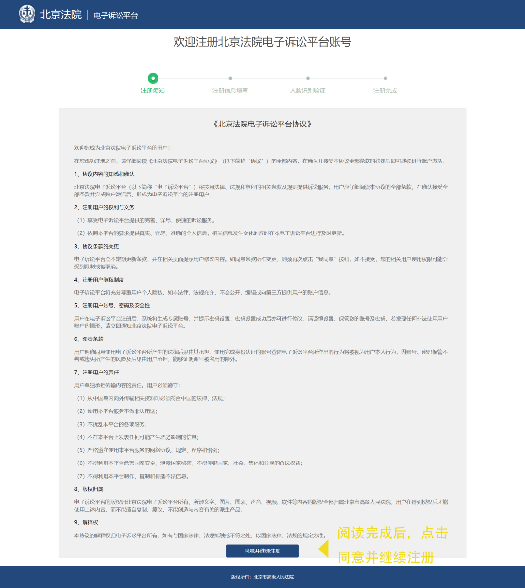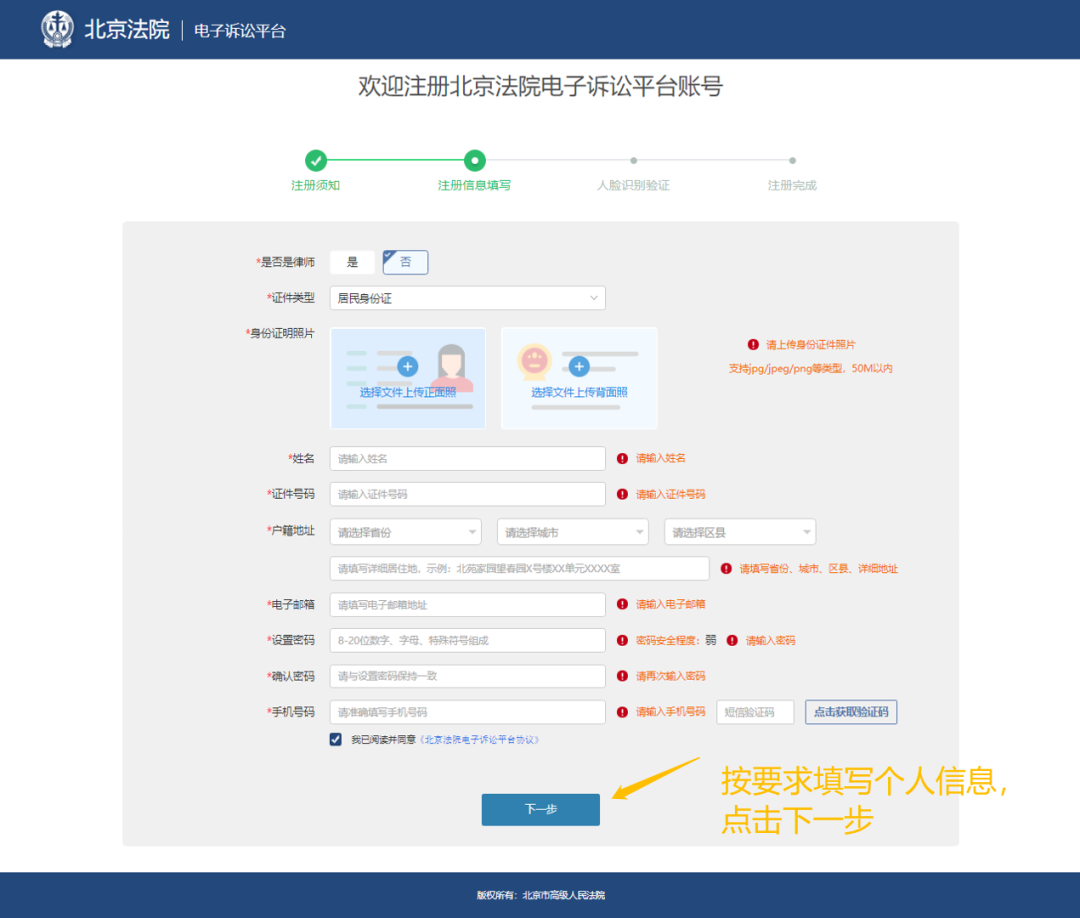 1.使用互联网搜索【北京法院电子诉讼平台】或者通过输入网址【http://sspt.bjcourt.gov.cn/】进入。首次进入,必须先进行【注册】,再【登录】。提示:如身份证末位是字母,必须是大写。