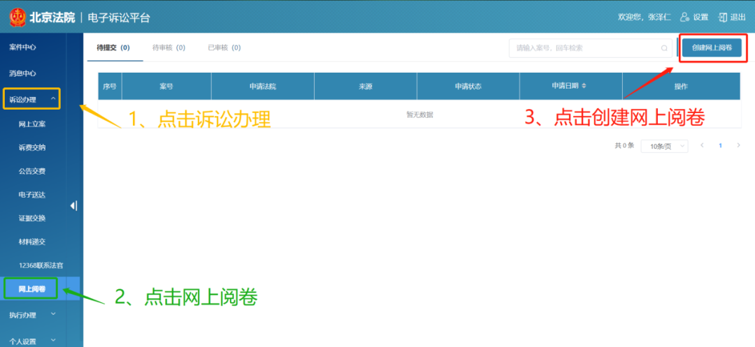 7.登录后点击【诉讼办理】,点击【网上阅卷】,点击【创建网上阅卷】。