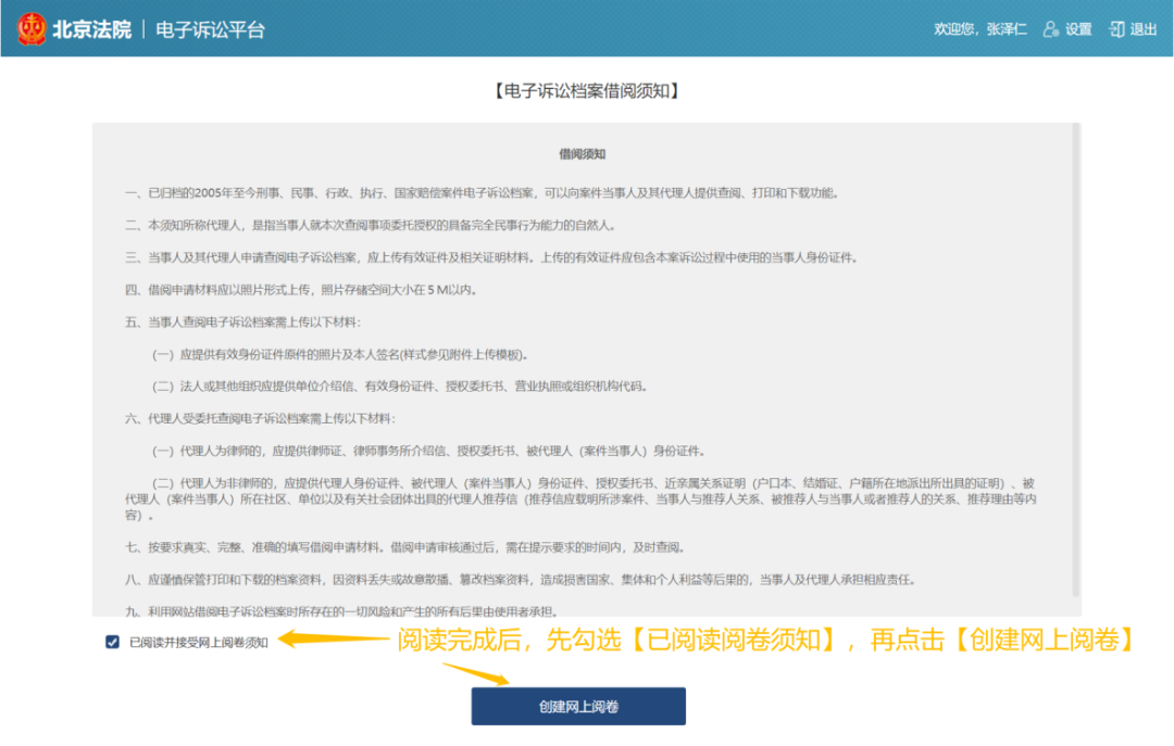 注意:因借阅的诉讼档案一般较大,申请审核通过后,当事人或代理人可以使用自己的身份证号注册登录北京法院电子诉讼平台【网上阅卷】模块进行下载查看。