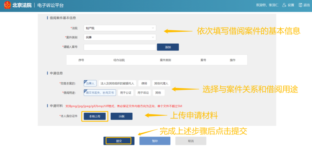 9.填写【借阅案件基本信息】,点击【添加】。提示:需准确填写法院、案件类型,按判决书右上角案件编号格式填写完整案号。填写【申请信息】,并按照要求,以示例为范本,上传申请材料。全部填写完毕,点击【提交】,等待审核。