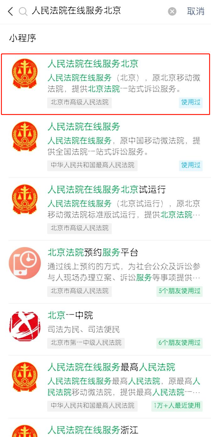 1.使用微信,搜索小程序【人民法院在线服务北京】。