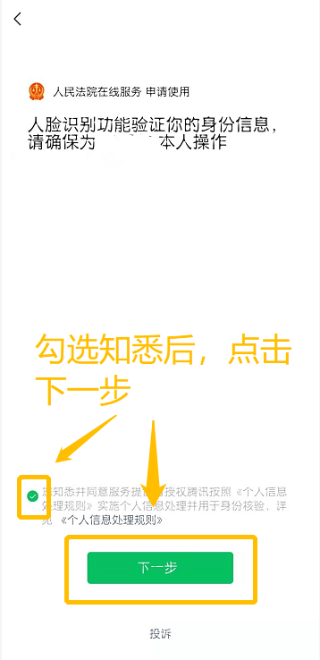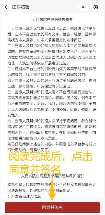 4.人脸识别完成后,阅读人民法院在线服务告知书,并输入手写签名,完成认证。