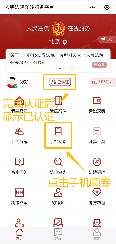 5.认证完成后,点击【手机阅卷】,即可申请查阅自身案卷。