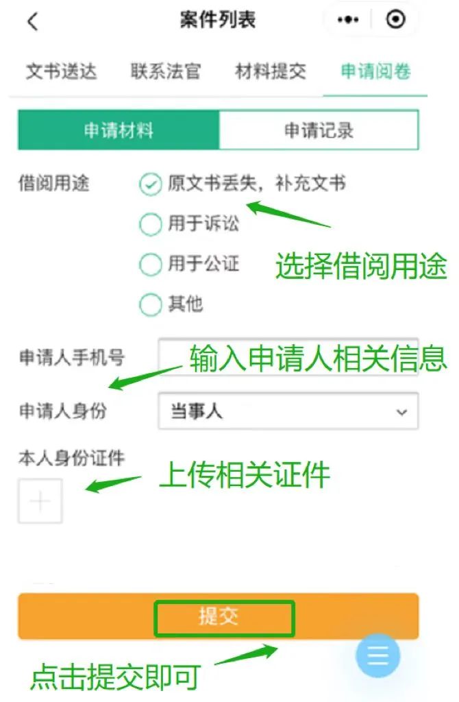 6.进入【手机阅卷】页面,在案件列表中选择申请查阅档案的案件,进入【申请材料】页填写申请信息,申请人身份可以为当事人、律师、法人及其他组织的被委托人、或者其他,填写借阅用途、申请人手机号、申请人身份,并上传身份证件、授权委托手续等材料,点击【提交】按钮,即可将查阅档案申请提交。