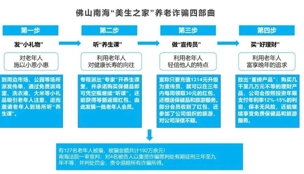 近年来,不少不法分子打着看病诊治、保健养生的旗号对老年人的养老钱实施诈骗,通过赠送免费讲座、免费礼品、免费旅游等形式骗取老年人的信任,层层设套,一步步诱导老年人落入其精心布下的投资陷阱。