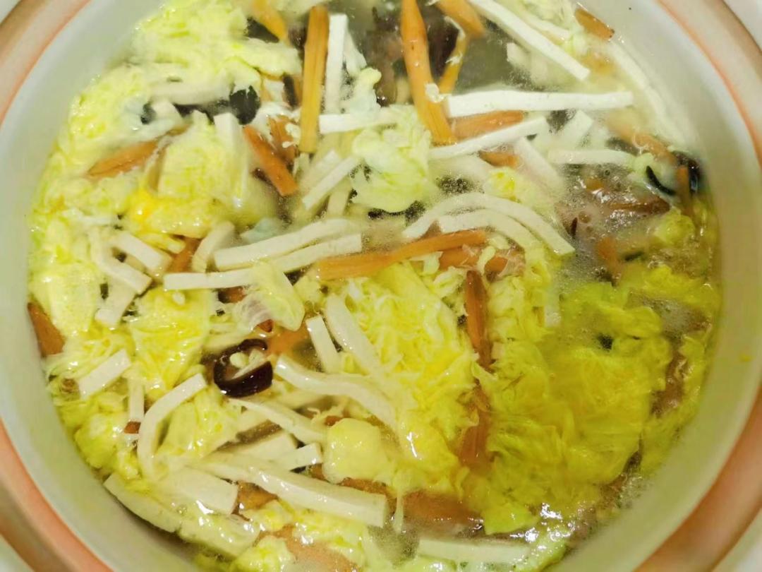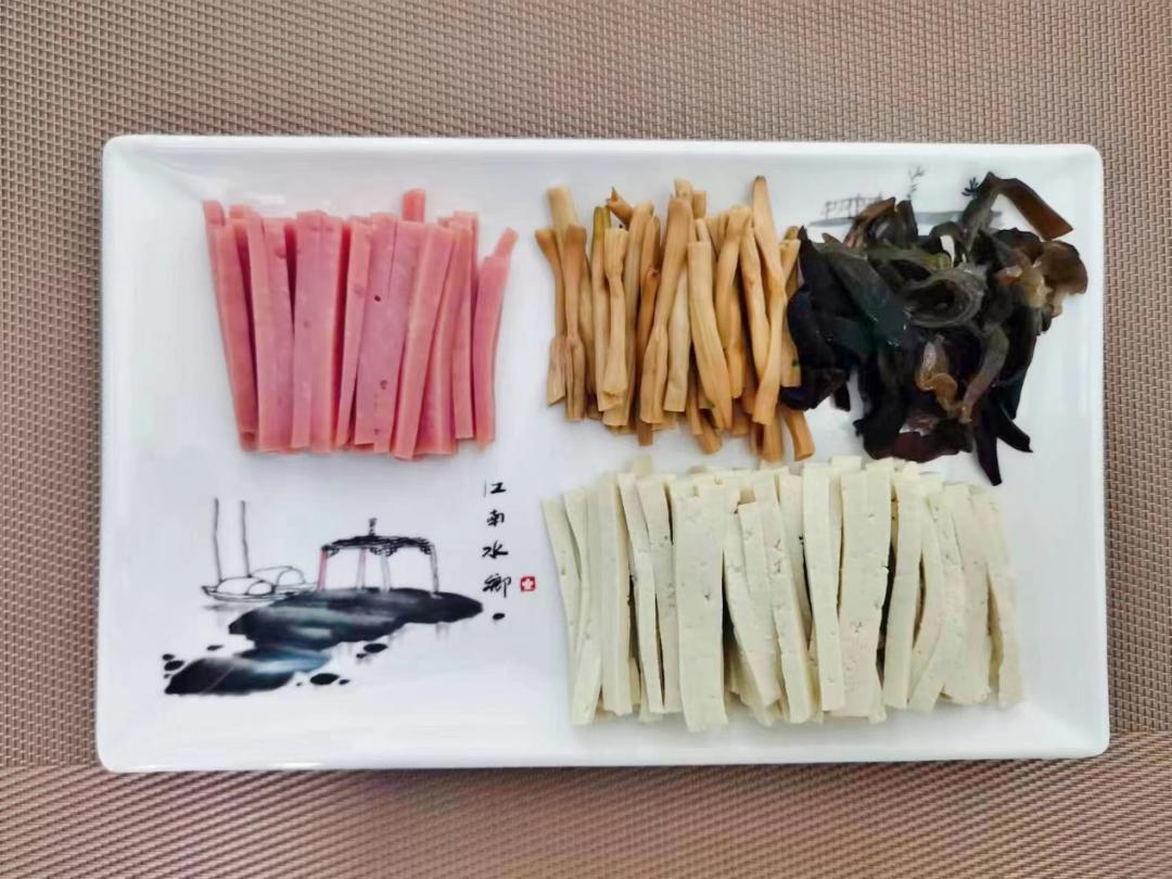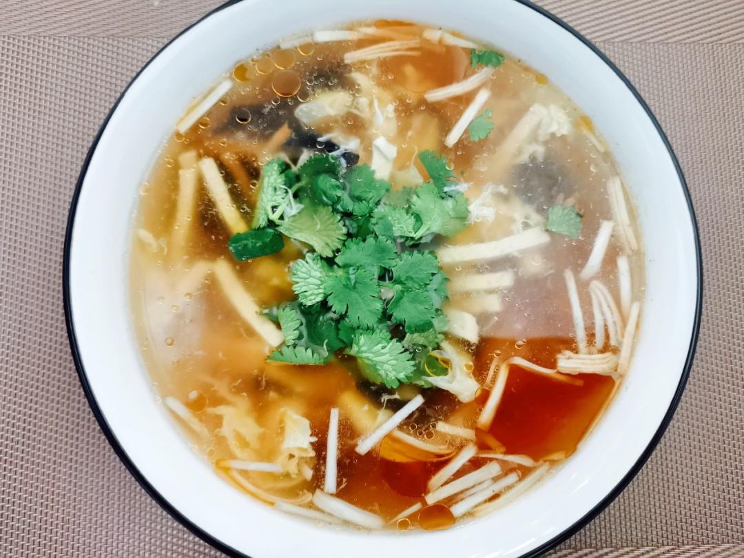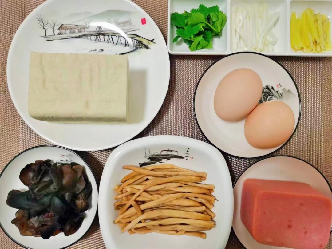 豆腐、鸡蛋、香菜、葱丝、姜丝、木耳、火腿、黄花菜(调料:胡椒粉、醋、酱油、香油、料酒、盐、淀粉)。