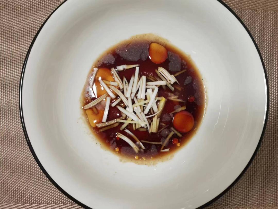 碗中放入胡椒粉、醋、酱油、香油调汁,加入葱姜丝,搅拌均匀,也可以根据自己喜好添加。
