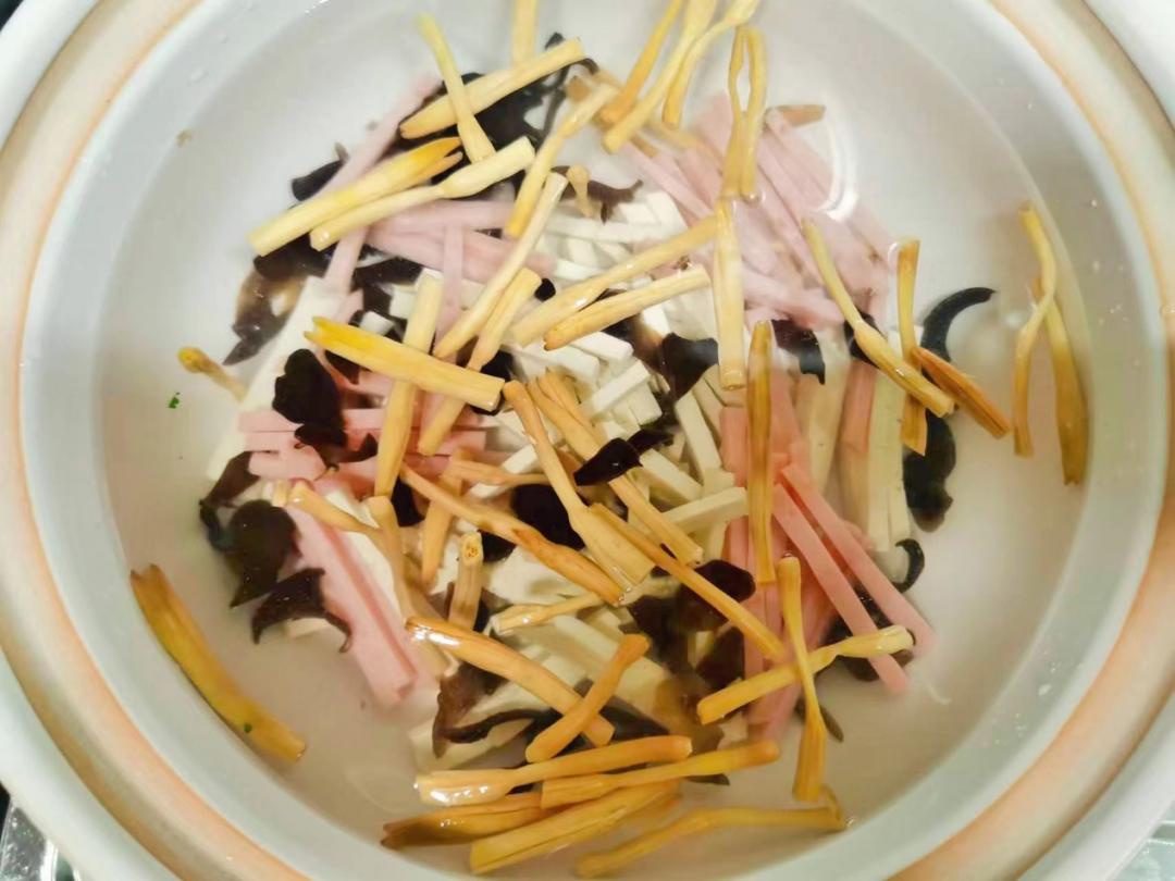 将豆腐、黄花菜、木耳、火腿焯水后捞出备用,焯水时可以加入少许料酒。