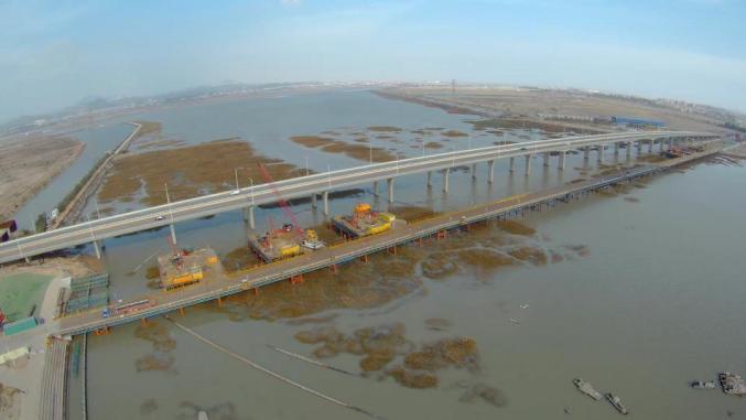 在海底修地铁难度大,在海上修地铁挑战也不小。跨海大桥水域宽度约680米,涉及海上作业较多,包括水上钢平台、钢板桩围堰、水中支架搭设、悬臂挂篮、塔吊等风险性较大的施工项目。施工期间,还要克服海上风浪、潮汐等带来的影响。