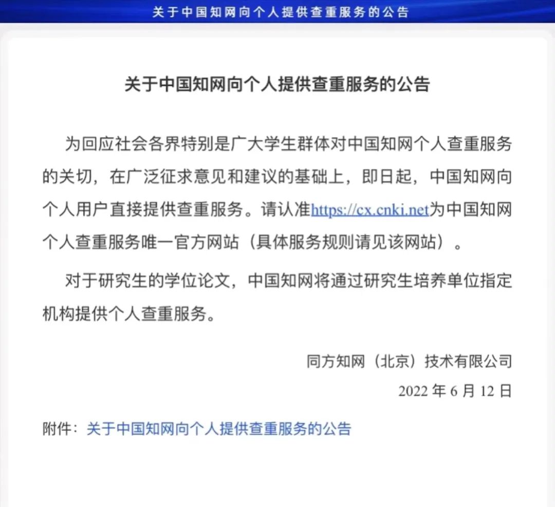 6月12日起,中国知网向个人用户直接提供查重服务,定价为1.5元/千字。对于研究生的学位论文,中国知网将通过研究生培养单位指定机构提供个人查重服务。