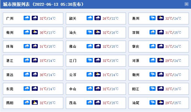 13日,韶关、清远和珠江三角洲的北部市县雷雨转暴雨局部大暴雨,其余市县多云,有雷阵雨局部大雨。