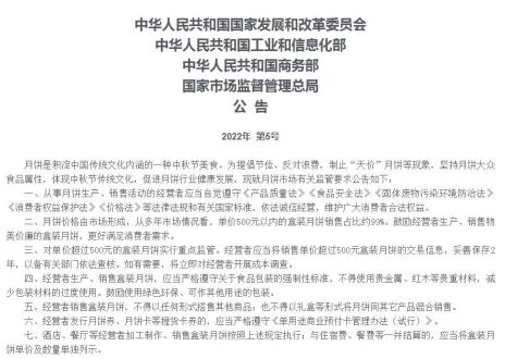 据国家发改委网站10日消息,国家发改委、工信部、商务部、市场监管总局联合印发通知,制止“天价”月饼等现象,对单价超过500元的盒装月饼实行重点监管。经营者应当将销售单价超过500元盒装月饼的交易信息,妥善保存2年,以备有关部门依法查核。如有需要,将立即对经营者开展成本调查。