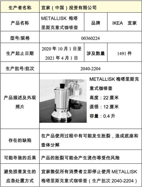 据" 上海市场监管 " 微信公众号消息,宜家(中国)投资有限公司在2022年6月8日至2022年9月7日召回2020 年10月1日至2021年4月1日期间生产的型号为00360224、生产批次为2040-2204的"IKEA宜家"METALLISK 梅塔里斯克意式咖啡壶,涉及1491件。