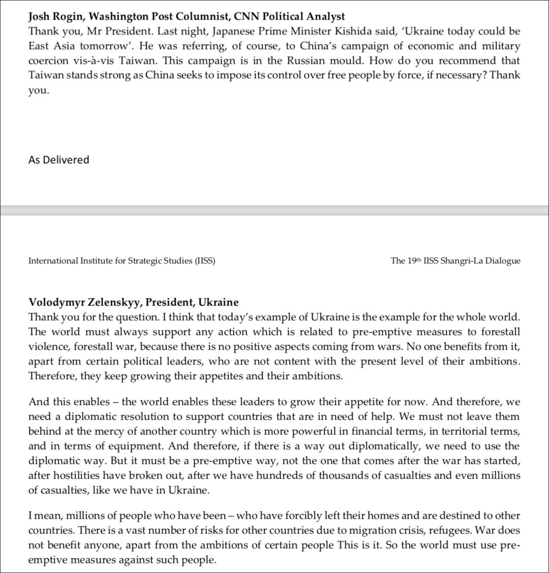 在英国国际战略研究所官方网站的香格里拉对话页面,可以找到6月11日泽连斯基演讲和回答现场观众提问的文字实录文件。