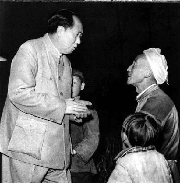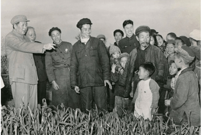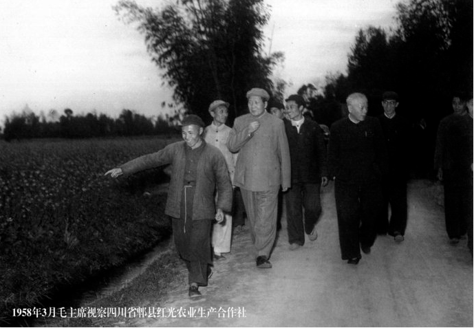 1958年3月16日傍晚,毛泽东主席视察四川省郫县红光农农业生产合作社和农业社的社员们在一起