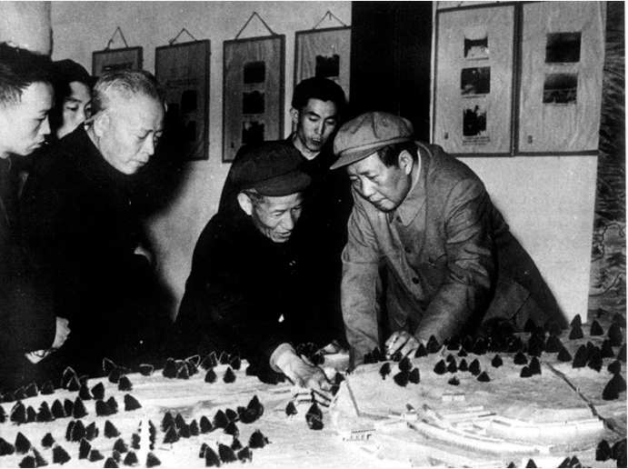 1958年3月21日,毛泽东主席在四川省灌县观看都江堰水利枢纽规划工程模型