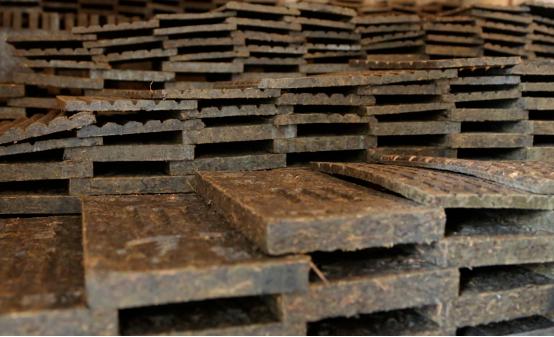 赤壁赵李桥青砖茶是用带梗的老叶来生产加工,要求叶面大、叶厚、内含营养物质丰富。茶叶采摘后,经过杀青、揉捻、晒干后制成毛茶,然后进入长时间的渥堆过程。渥堆工艺俗称为“发酵”,是形成青砖茶产品独特口感滋味、香气等内质要求的关键阶段,此阶段又分为两个工艺过程,即小堆渥堆和大堆渥堆。渥堆工艺时间最短需要6个月以上,最长2-6年。接下来就是复制工艺过程。将拼配好的原料进行蒸制,一方面是为了将茶叶里的果胶质蒸出来,另外一方面是为了高温消毒,把原料蒸好之后倒入模具铺洒、抹匀、压制,直到大大小小71道工序完成,才最终形成一块赵李桥砖茶。