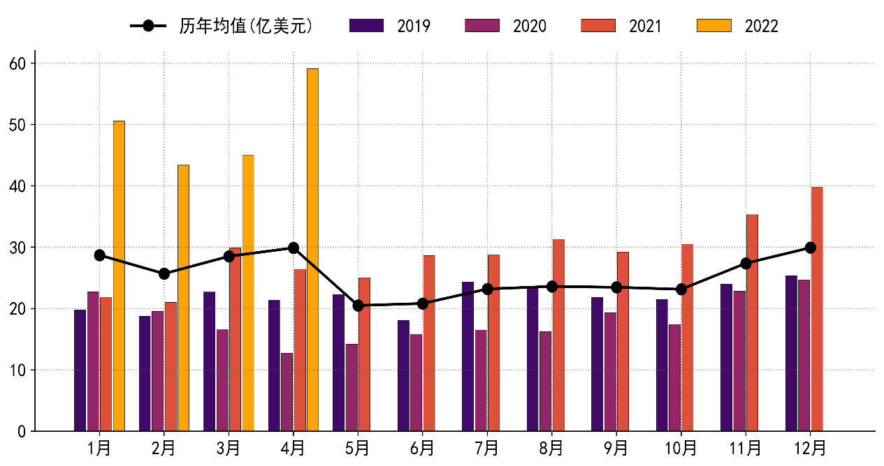 图2 2019-2022年土耳其与俄罗斯进出口金额年内周期简析