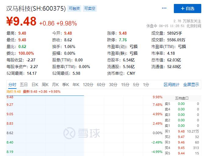 6月15日,汉马科技开盘一字涨停,截至午间收盘仍封死涨停板,报9.48元/股,总市值为62亿元。