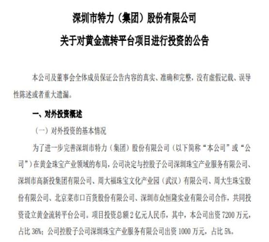 公告显示,为了进一步完善深圳市特力(集团)股份有限公司在黄金珠宝产业领域的布局,公司决定与控股子公司深圳珠宝产业、深圳市高新投集团、周大福珠宝文化产业园(武汉)有限公司、周大生珠宝、北京菜市口百货、深圳市众恒隆实业合作,共同投资设立黄金流转平台公司。