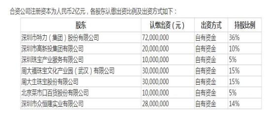 根据公告,该项目投资总额2亿元,其中特力A出资7200万元,占比36%;公司控股子公司深圳珠宝产业出资1000万元,占比5%。此外,周大福、周大生、菜市口百货持股比例分别为15%、15%、5%。