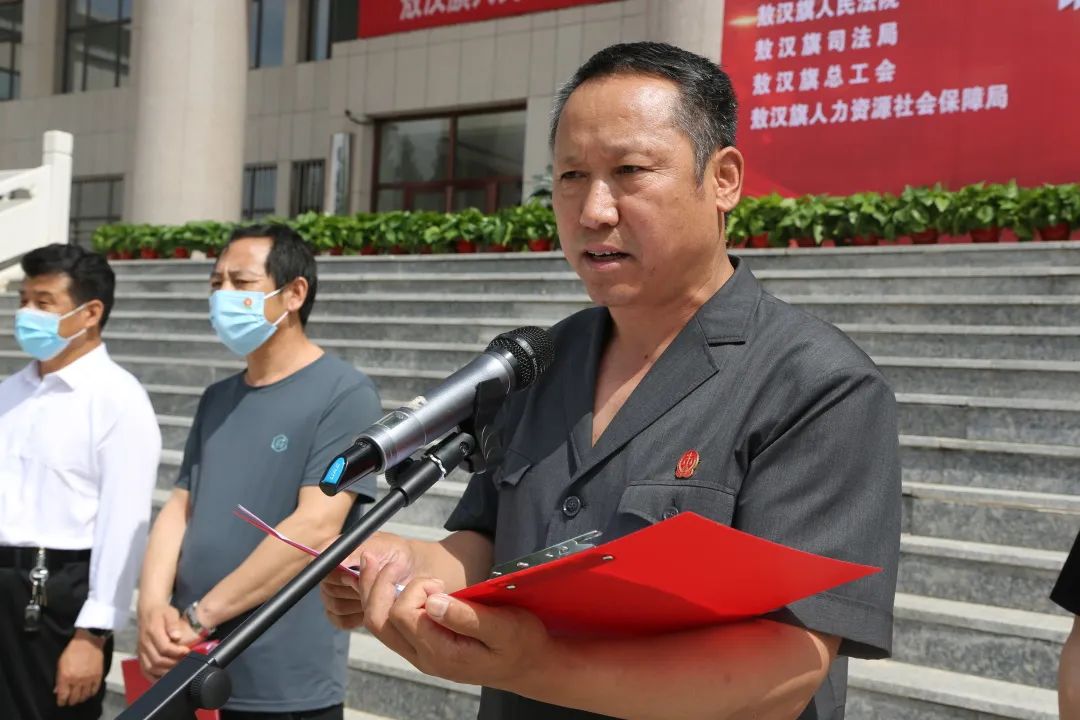 6月15日,旗法院举行诉调对接中心暨劳动争议诉调对接工作室揭牌仪式。党组书记、院长刘大勇出席揭牌仪式并致辞。