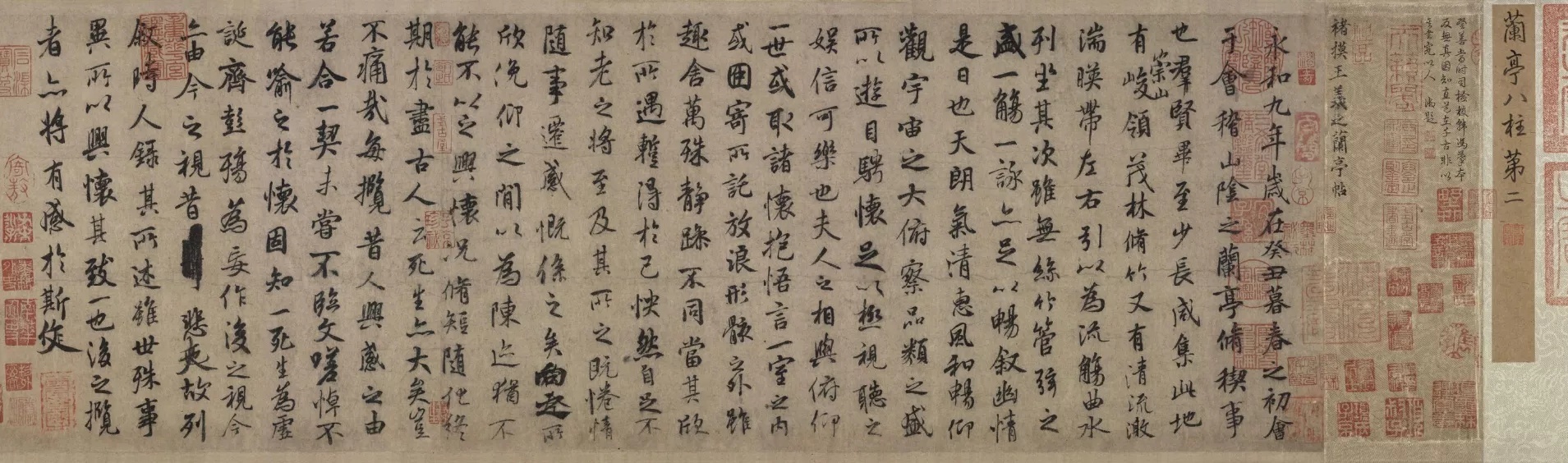 公元 353年上巳节,东晋名士 40余人在会稽山阴举行了一次修禊活动,他们曲水流觞,燕饮抒怀。在将当日所做诗文汇编成《兰亭集》之后,王羲之欣然提笔,撰写序文,这就是《兰亭序》,一篇应景式的文学作品,竟催生了书法艺术水准极高的“天下第一行书”。而颜真卿的《祭侄文稿》、苏东坡的《黄州寒食诗帖》均因有十分高超的文辞与书艺表达成为天下翰墨名篇。这就是文学与书艺的密切关系,因为它们都是以思想和语言为基础的,通俗地说就是古人所说的“意”。“意”在古文字解读中由“心”和“言”两部分组成。王羲之成功地探索了汉字手写便捷、美观的表现规律,依托自己深厚的文学学养与艺术技巧,铸就了《兰亭集序》的经典地位。这就是书法必须以有意义的文辞为表现内容,艺文兼备,表达作者对客观世界的认知与情感。(《抱云堂艺评》)