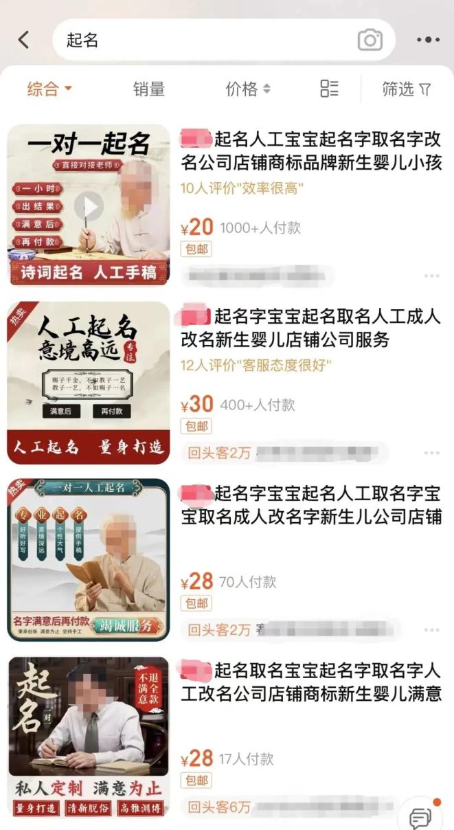 在一些网购平台输入“起名字”一词,各式各样的起名服务映入眼帘,价格从几十元到上百元不等。不少商家的起名服务还打着“国学”旗号,头像多是一位头发花白、身着唐装的老者照片,有些正在写书法、有些手持书本,展现出学识深厚的气质。还有一些销量靠前的商家,打出“人工起名”“满意为止”“意境高远”“不满意不付钱”等广告语吸引顾客。