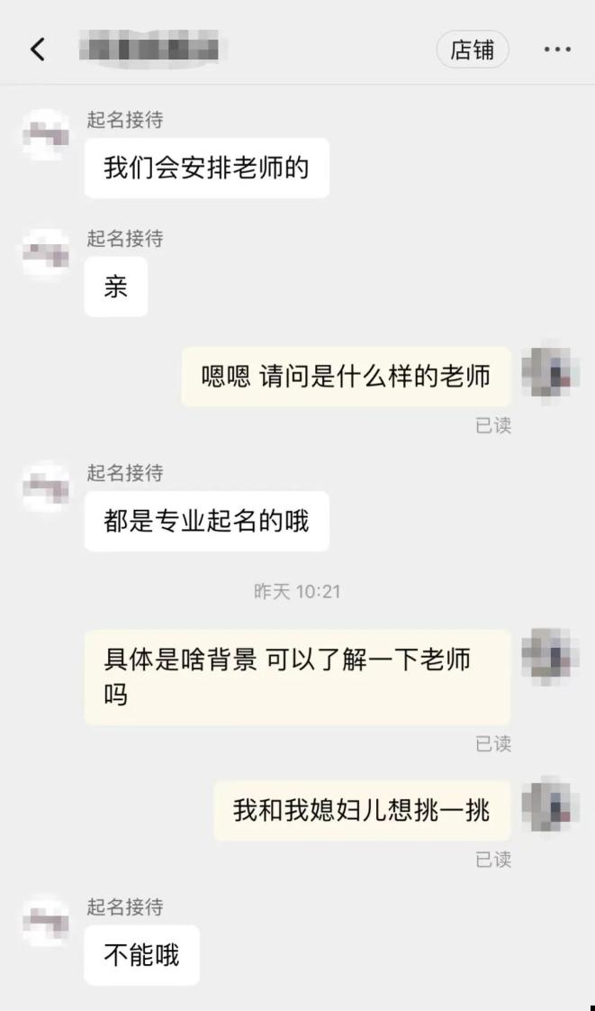 当焦女士提出“不太满意”希望“大师”再给起几个名字时,对方便支支吾吾躲避回答。焦女士提出电话沟通也遭到了对方的拒绝。焦女士对这位起名“大师”很失望。