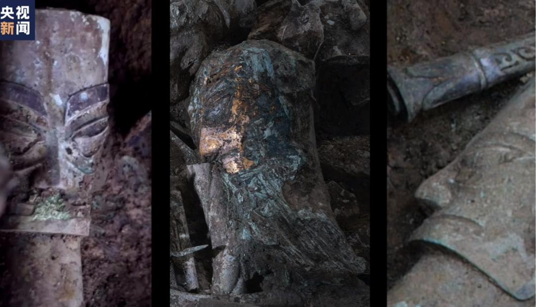 位于8号坑的三星堆金面罩铜头像今日提取。它是三星堆新一轮考古发掘中唯一一件仍附着在青铜头像上的黄金面罩。