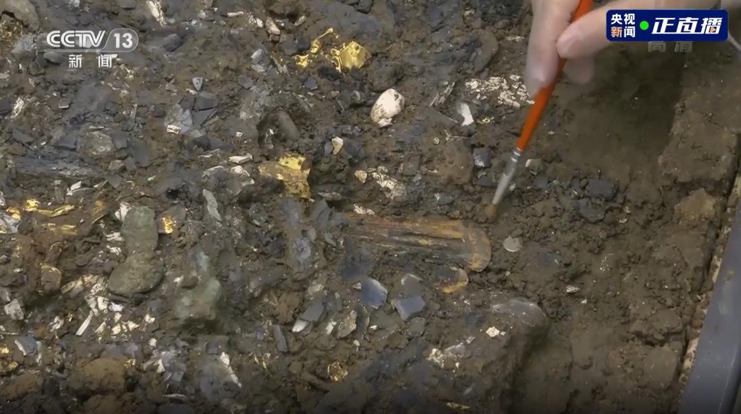 今日,央视三星堆发掘直播中还展现了5号坑最新清理出的斧型金器,最宽大概有4.6厘米,长度超10厘米,厚度至少3毫米,几乎是目前为止在三星堆看到的最厚金器。