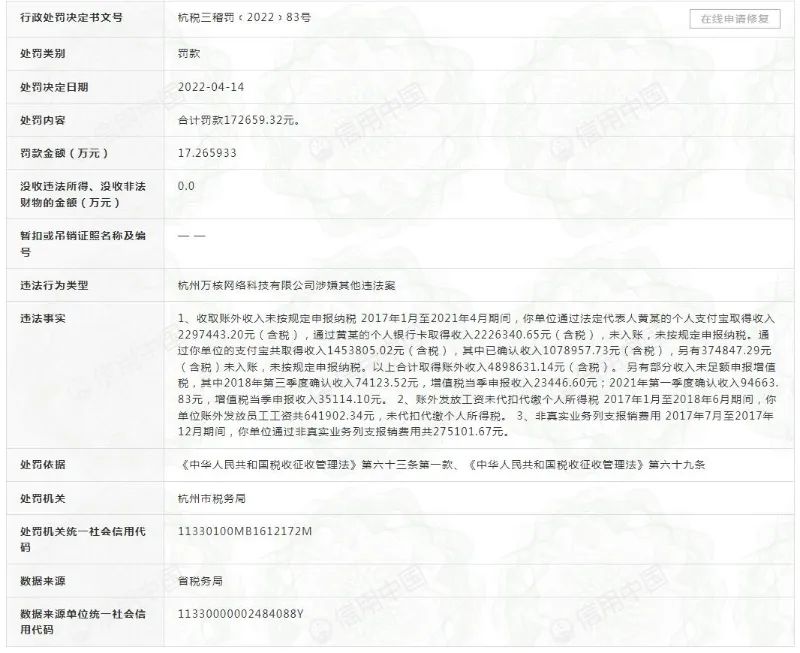 据多家媒体报道,杭州万核网络科技有限公司近日因违反《税收征收管理法》被杭州市税务局合计罚款约17.26万元。据企查查显示,万核网络通过法定代表人个人支付宝、银行卡分别取得收入2297443.20元(含税)、2226340.65元(含税),未入账,未按规定申报纳税;通过单位支付宝取得收入374847.29元(含税)未入账,未按规定申报纳税;部分收入未足额申报增值税;账外发放工资641902.34元,未代扣代缴个人所得税;非真实业务列支报销费用275101.67元。