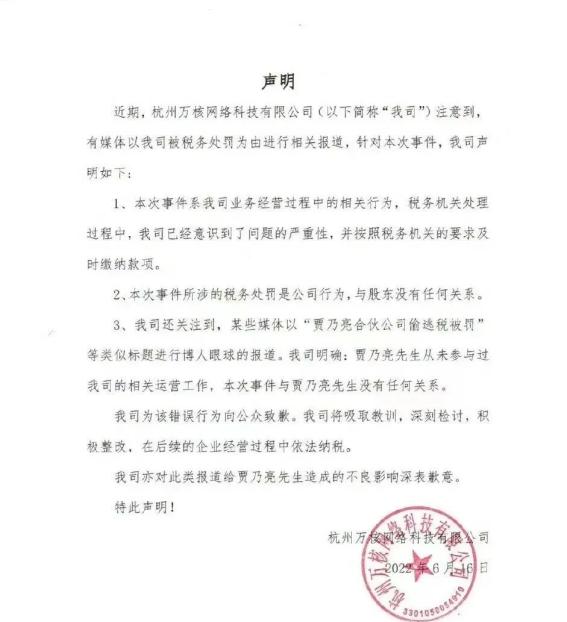 万核网络发出声明,并向贾乃亮致歉。声明中称,公司已经缴纳了罚款,此次涉及的税务处罚是公司行为,与股东没有任何关系。贾乃亮从未参与公司的任何运营管理工作,和他没有任何关系。