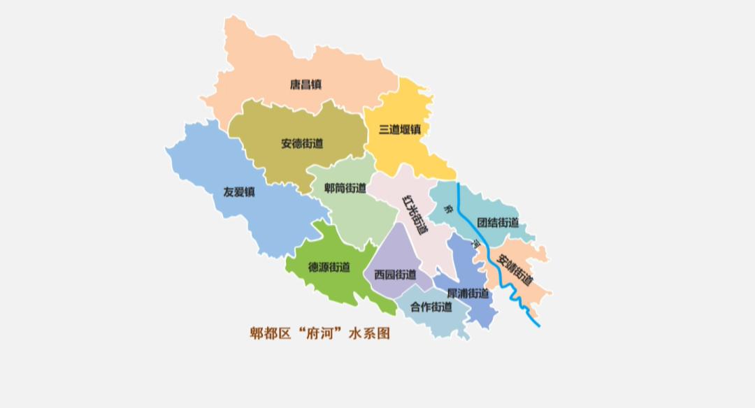 府河自北向南流经郫都区,境内全长约22.5公里。