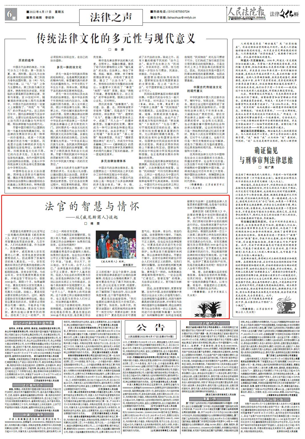 我们必须承认,戏剧中,法官的裁量结果是符合道德和人情的。如果我们是法官,也应当以朴素的公平正义观为基本指引。正如《慎子》所言,“法者,非从天下,非从地出,发乎人间,合乎人心而已。”法律是基本的道德,以符合公平正义要求、维护个人基本权利、促进人与社会的共同发展为目标。法官是法律的执行者,应当时刻以法的实质正义为终极追求,在每个具体案件中呈现国家大义、衡量民众伦理、评判是非曲直,作出“合乎人心”、向善向上的司法裁判。这个故事之所以能够流传数百年,也正是因为其符合人们对正义、对法律的基本期待。
