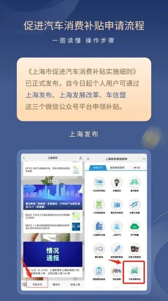 进入上海发布微信公众号平台的“市政大厅”,点击“汽车消费补贴”选项,选中“2022年度促进汽车消费购车补贴申请”即可申请。具体操作详见↓