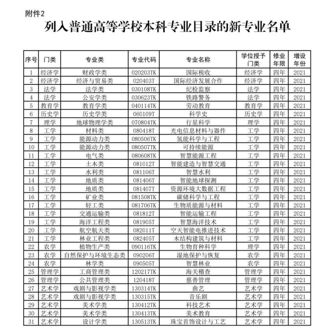据了解今年各高校在专业种类、培养趋势、复合人才特殊需求、办学体制、技术技能培养等几方面体现了新的特点。今年普通高校新增本科专业31种,包括碳储科学与工程、空天智能电推进技术、生物育种科学、资源环境大数据工程、智慧水利等,这些专业都是在全国高校中首次设置,共有38所高校通过了新增专业审批。