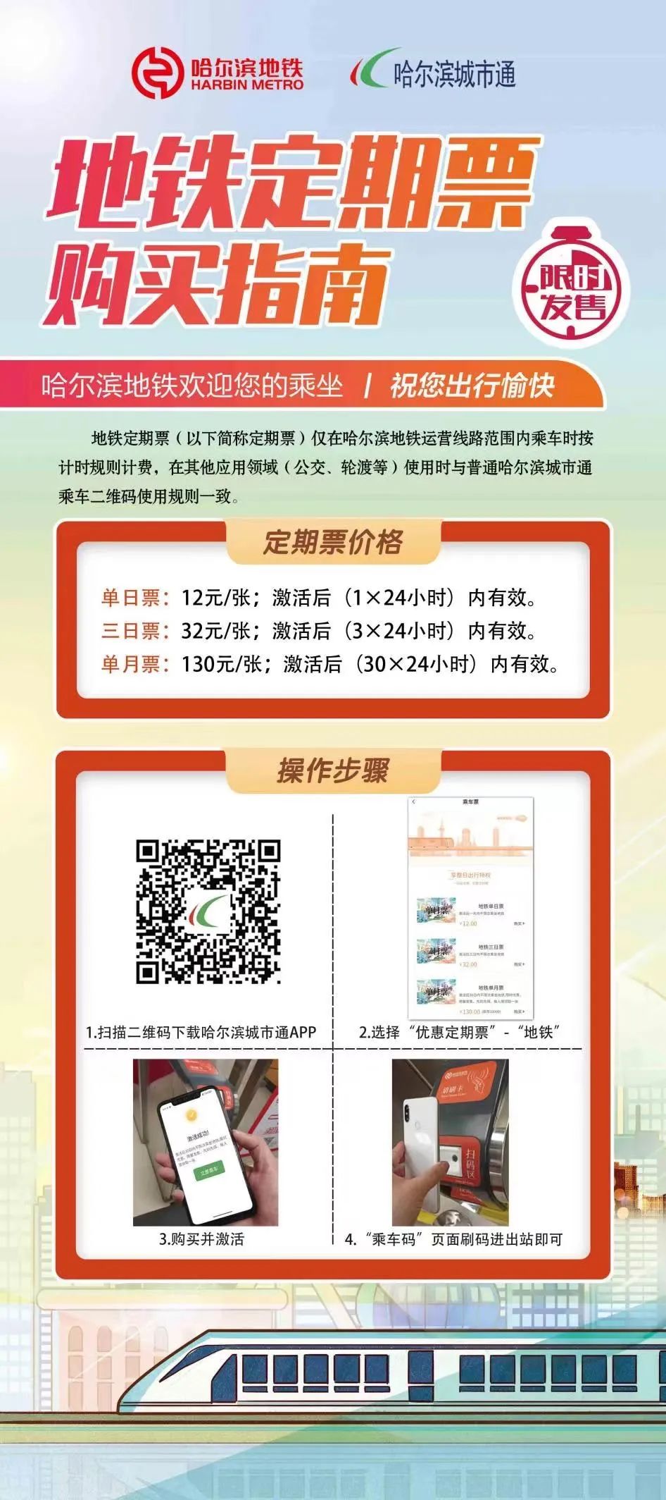 使用“哈尔滨城市通”App购买并激活地铁“电子月票”后,可在激活之时起的30日内运营时间中不限里程、不限次数乘坐地铁。