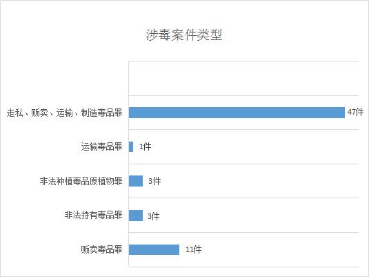 其中,判处贩卖毒品罪11件,非法持有毒品罪3件,非法种植毒品原植物罪3件,运输毒品罪1件,走私、贩卖、运输、制造毒品罪47件。
