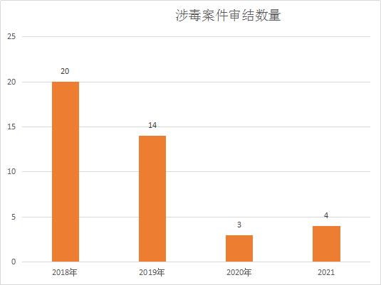 2017年审结涉毒案件24件;2018年审结20件;2019年审结14件;2020年审结3件;2021年审结4件。