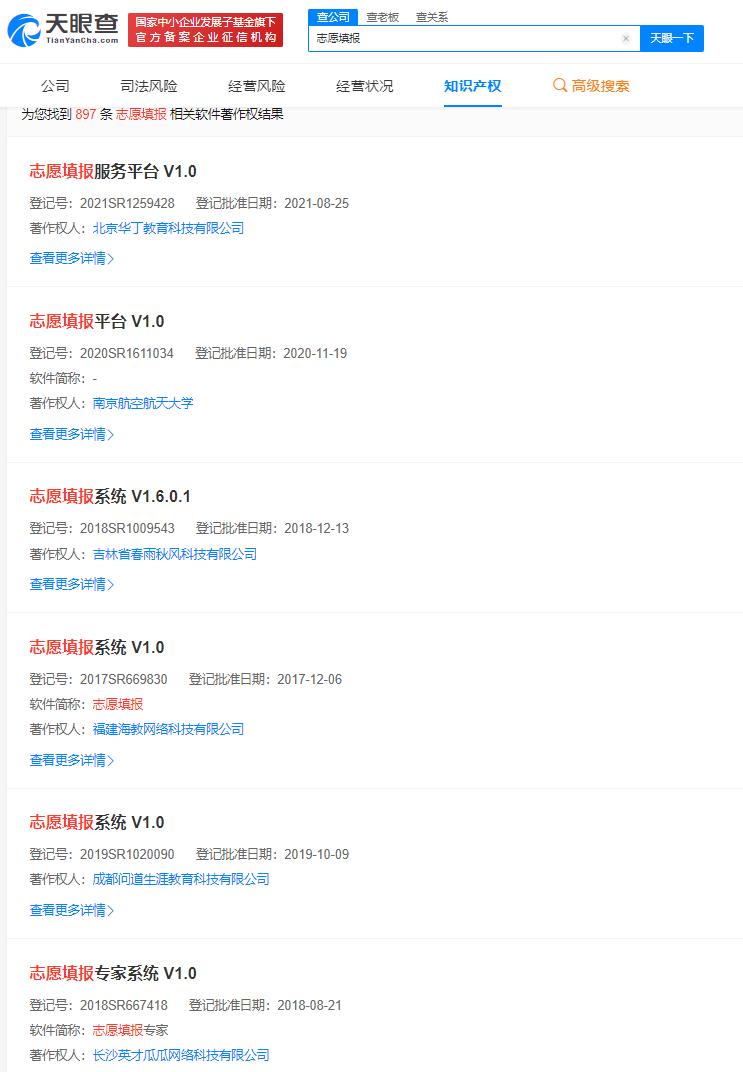 天眼查App数据显示,截至目前,我国已有897条志愿填报相关软件著作权获登记批准,包括“志愿填报服务平台”“志愿填报院校范围规划系统”“智能志愿填报系统”等。从软件名称来看,这些软件的适用范围包括高考、成人高考、艺考、中考等,服务内容涉及志愿填报、志愿填报辅助决策、志愿填报专业推荐等。这些软件的著作权人以教育培训公司、网络技术公司居多,此外还有多所高校开发的志愿填报系统获批,如江苏大学的“高考志愿填报后台信息管理系统”江西师范大学的“高考志愿填报资讯系统”等。