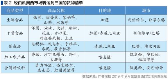 两国从喀麦隆市场进口的粮食蔬菜基本来自喀麦隆当地。主要供应区域包括恩特姆市(Vallée-du-Ntem),凯奥西周边村庄,还有喀麦隆西部、中部、东部和南部的一些地区。每个产地专门生产某一类特定产品。例如,农产品和蔬菜产品主要来自喀麦隆中部、西部、南部、东部、西南部和北部地区。这些产品由通常被称为“buy-and-sellam”的批发商出口到喀麦隆边境市场。产品抵达市场后,零售商先买下产品,再转卖给外国买家。值得注意的是,这些外国买家主要由女性批发商组成,她们在边境市场购买大量农产品和蔬菜产品。得益于上述批发商的商业活动,加蓬市场上的摊位摆满了来自喀麦隆的牛油果、调味品和饭蕉。
