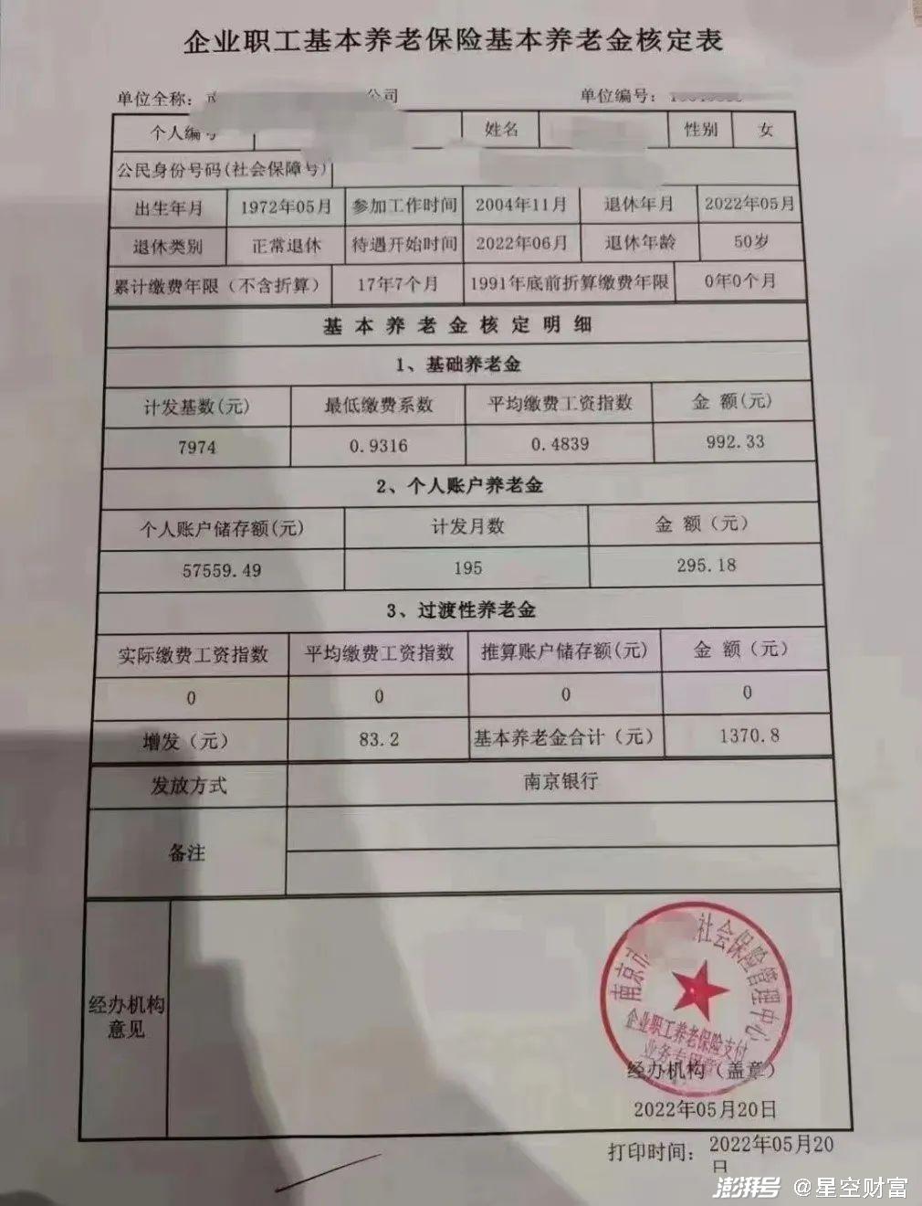 晓莹仔细一看数字,大受震撼,正常退休,从2022年6月起,每月基本养老金合计1370.8元。