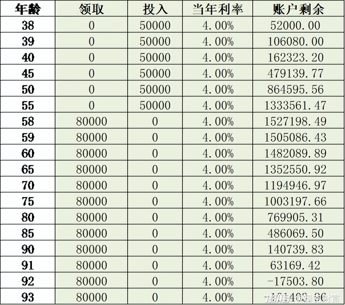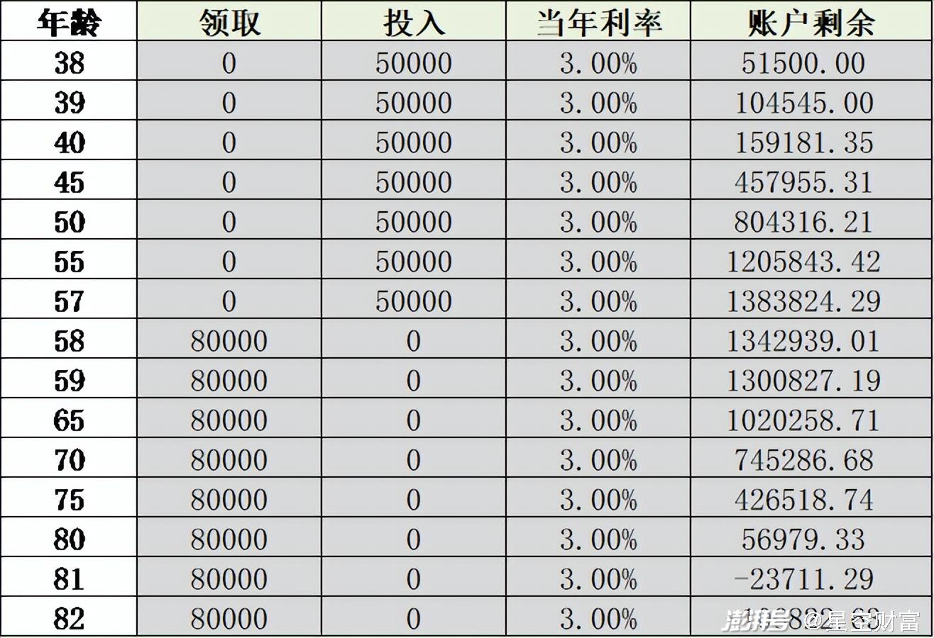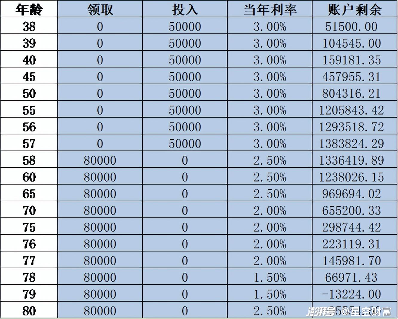 “还有个问题,利率一直在下行的,有可能20年之后,利率没有3%了,会下跌到2%,慢慢还会降到1%。假设每10年跌0.5%,那么表格模拟出来,可以领取到78岁。”